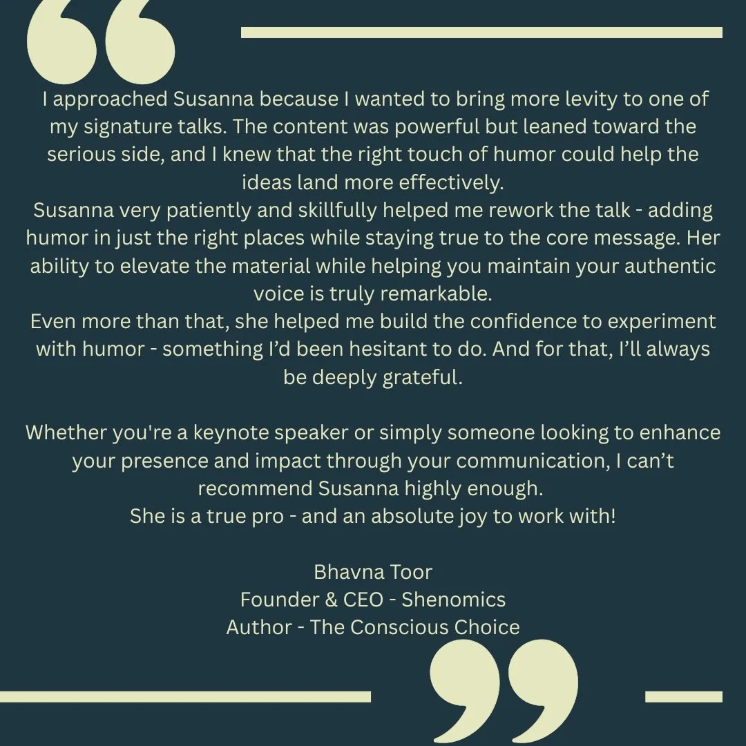 “I’ve had the wonderful opportunity to feature Susanna Spies as both a conference presenter and a retreat facilitator. In both instances, I - along with our audience - was inspired by her passion for harnessing the power of humor to connect us on a deeper level. Susanna uses humor to remind us of our shared humanness. I believe we need more of that.”- Amanda Struemer, Founder of Muse Conference & Muse Camp